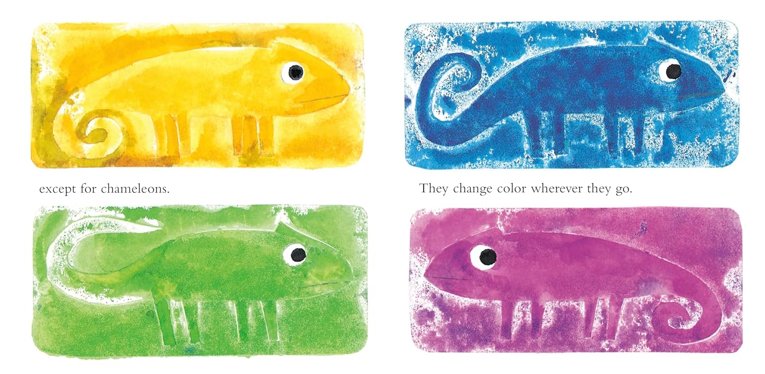 Elephants are gray, pigs are pink, and parrots are green. Only the chameleon has no color of his own. He is purple like the heather, yellow like a lemon, even black and orange striped like a tiger! Then one day a chameleon has an idea to remain one color forever by staying on the greenest leaf he can find. But in the autumn, the leaf changes from green to yellow to red . . . and so does the chameleon. When another chameleon suggests they travel together, he learns that companionship is more important than having a color of his own. No matter where he goes with his new friend, they will always be alike.