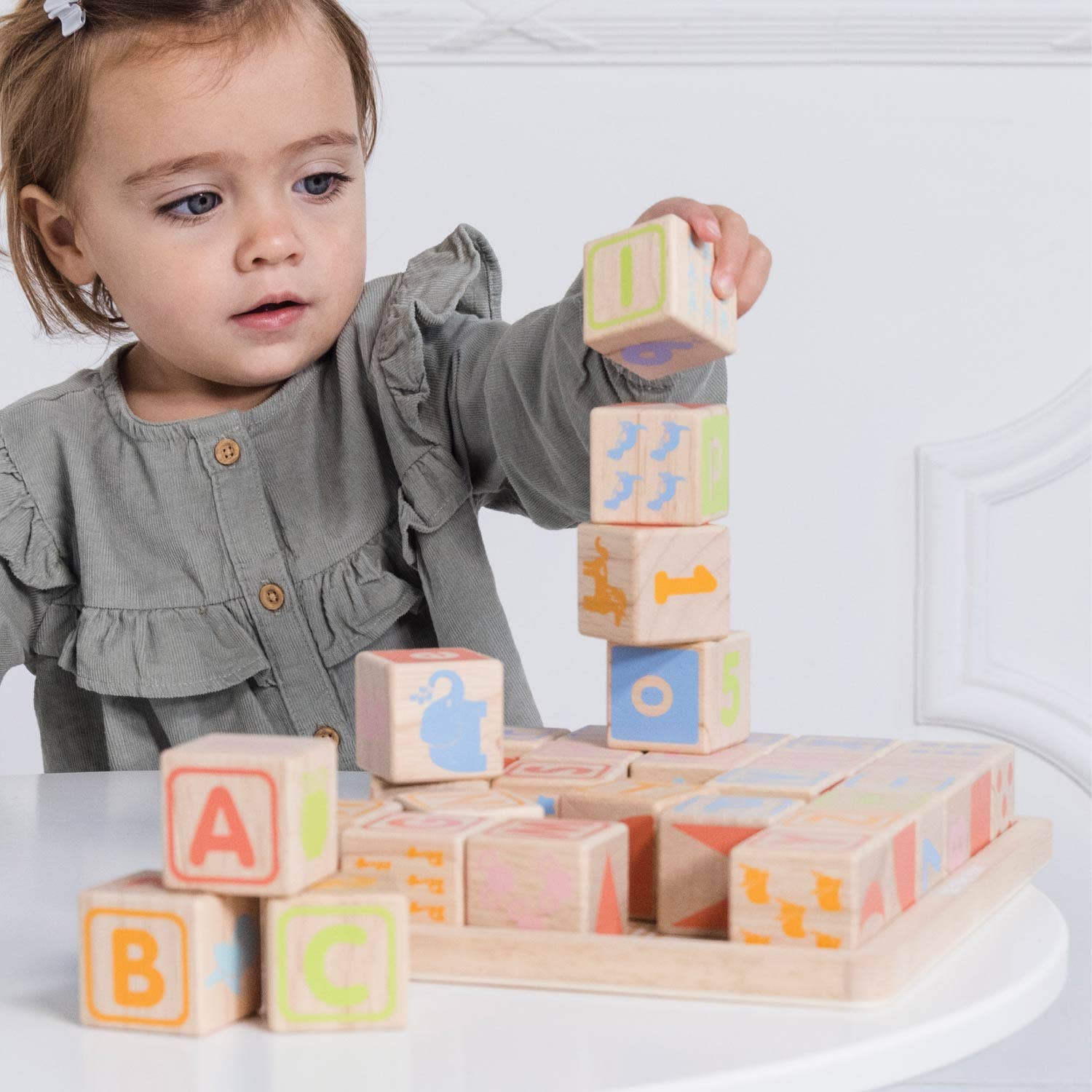 Teach little learners the alphabet with this classic children's wooden toy. This set of 30 solid wooden blocks was made for fun with its brightly colored chunky wooden play pieces, perfect for small hands to grasp.