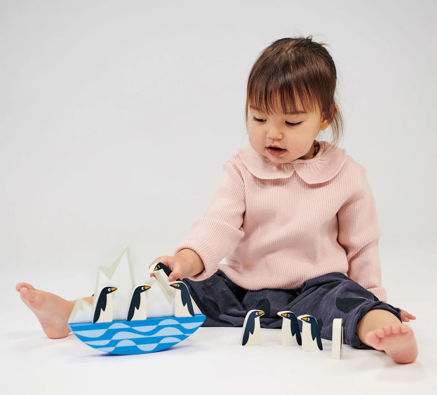 This is a wooden balancing toy with 8 wooden penguins to balance on the rocking iceberg.