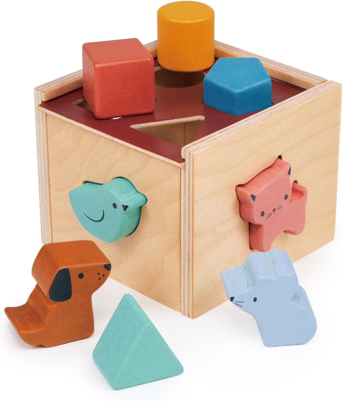 A plywood cube with cut-out shapes on all 4 sides. Lid is removable and has 4 cut-out shapes. Features 4 solid wood animals and 4 classic 3 dimensional shapes in different colors.