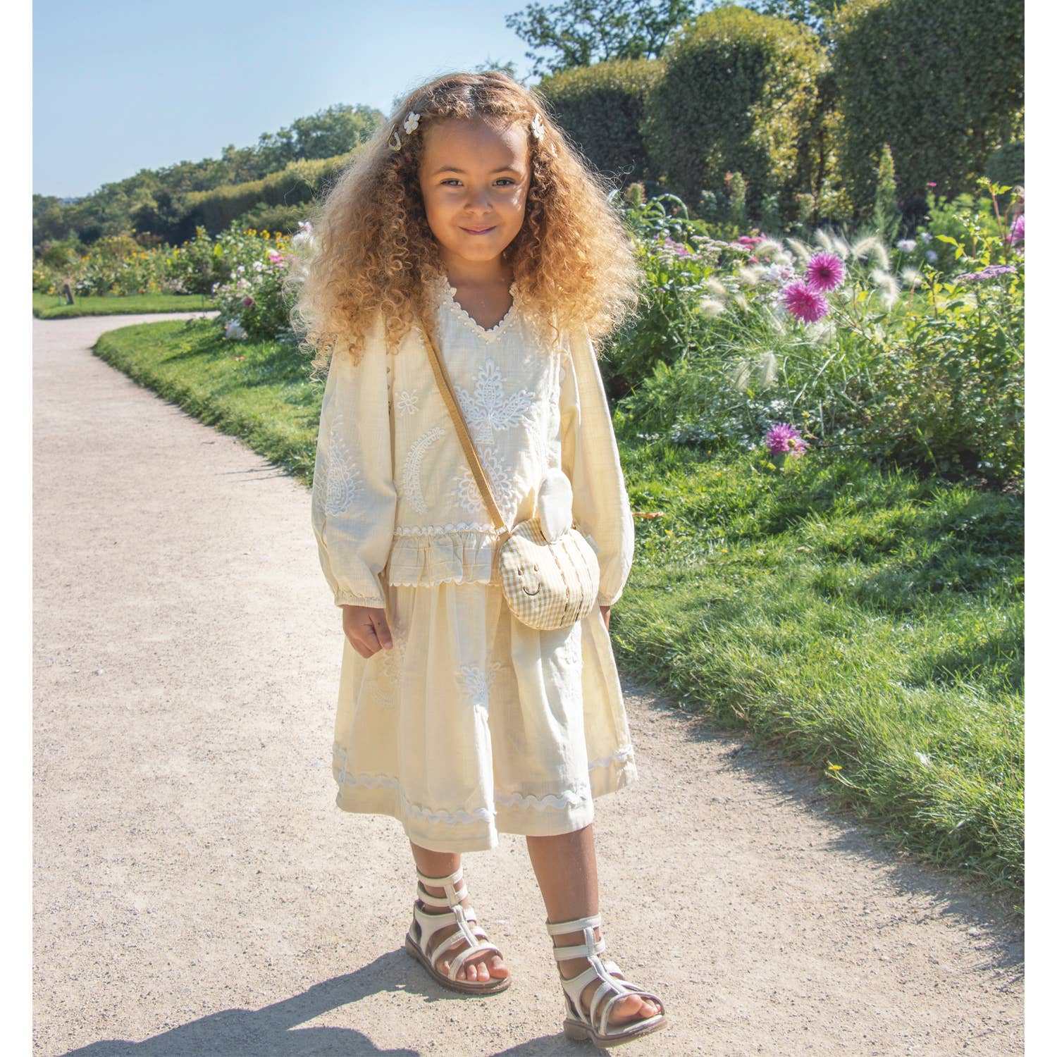 Meet Beryl the bumble bee bag - the busiest but cutest addition to your summer outfit! Made from gorgeous soft yellow gingham fabric with sweet little wings and embroidered with a sweet little face. This bag is fully lined with spotty fabric, has a mag dot closure and has an adjustable cross body strap with a break point for safety. Matching clips and ponies also available.