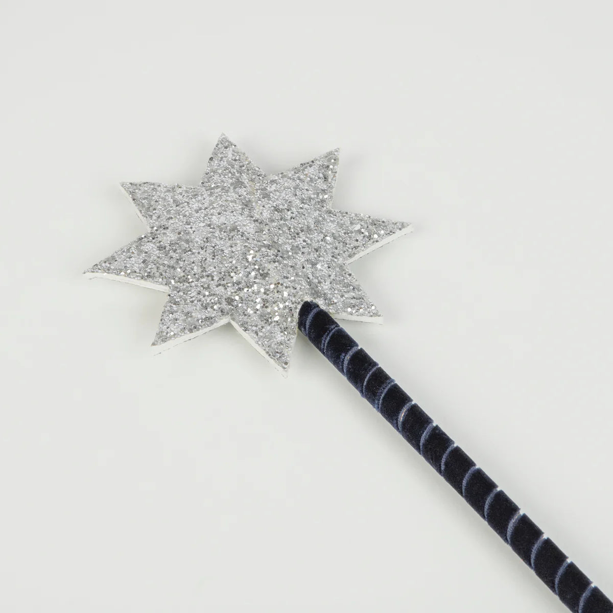 - The wand is topped with a silver glitter fabric star, and has a blue velvet ribbon wound around the wooden handle
