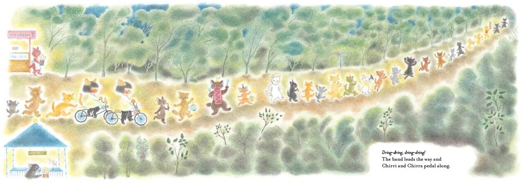 With the light of their trusty bicycles and a glorious full moon illuminating the darkness, Chirri and Chirra go on a nighttime adventure, accompanied by their new cat friends. From fizzy full-moon drinks that give them cat ears and tails to sparkling flower necklaces that grant them access to a special night market, the inseparable duo enjoys all the dreamy treats that the Full Moon Festival has to offer, basking in the warmth and light of discovery, generosity, and friendship.