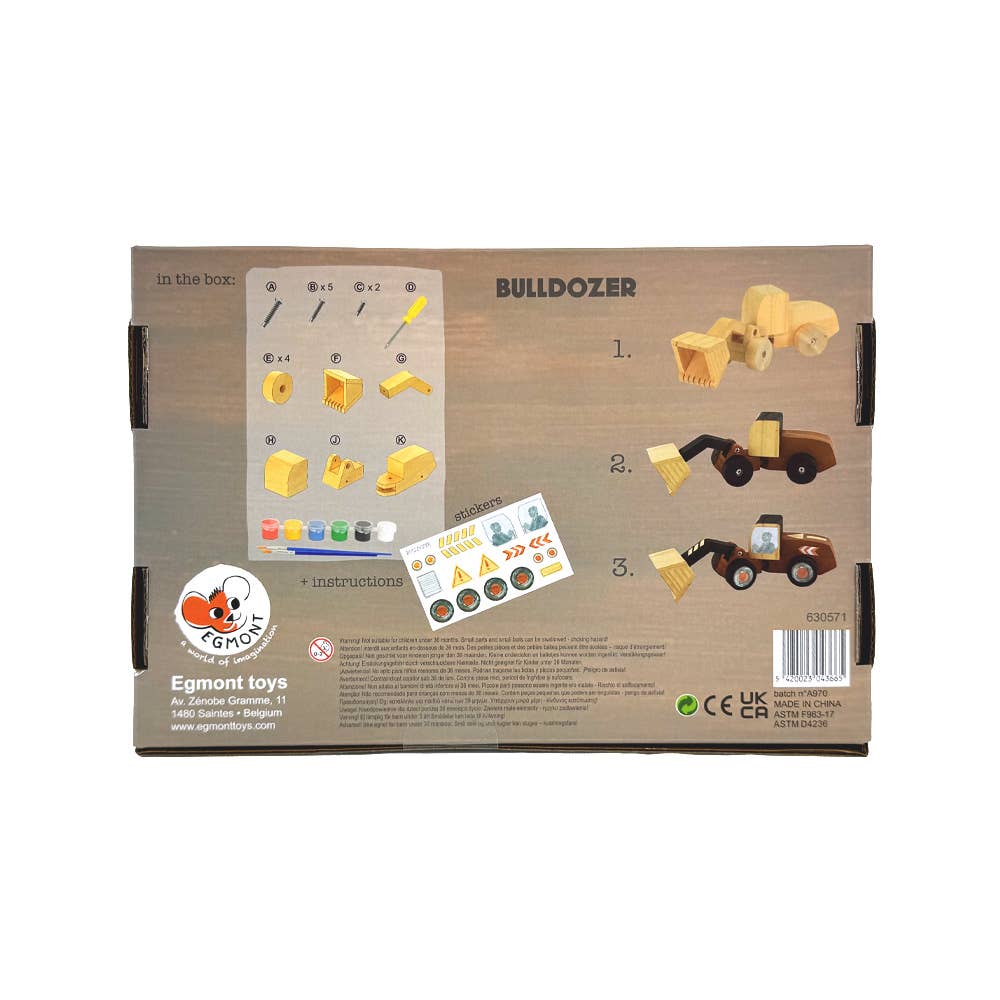 Build your own wooden bulldozer and unleash your creativity! This all-in-one kit comes with everything you need to assemble, paint, and decorate your very own bulldozer.