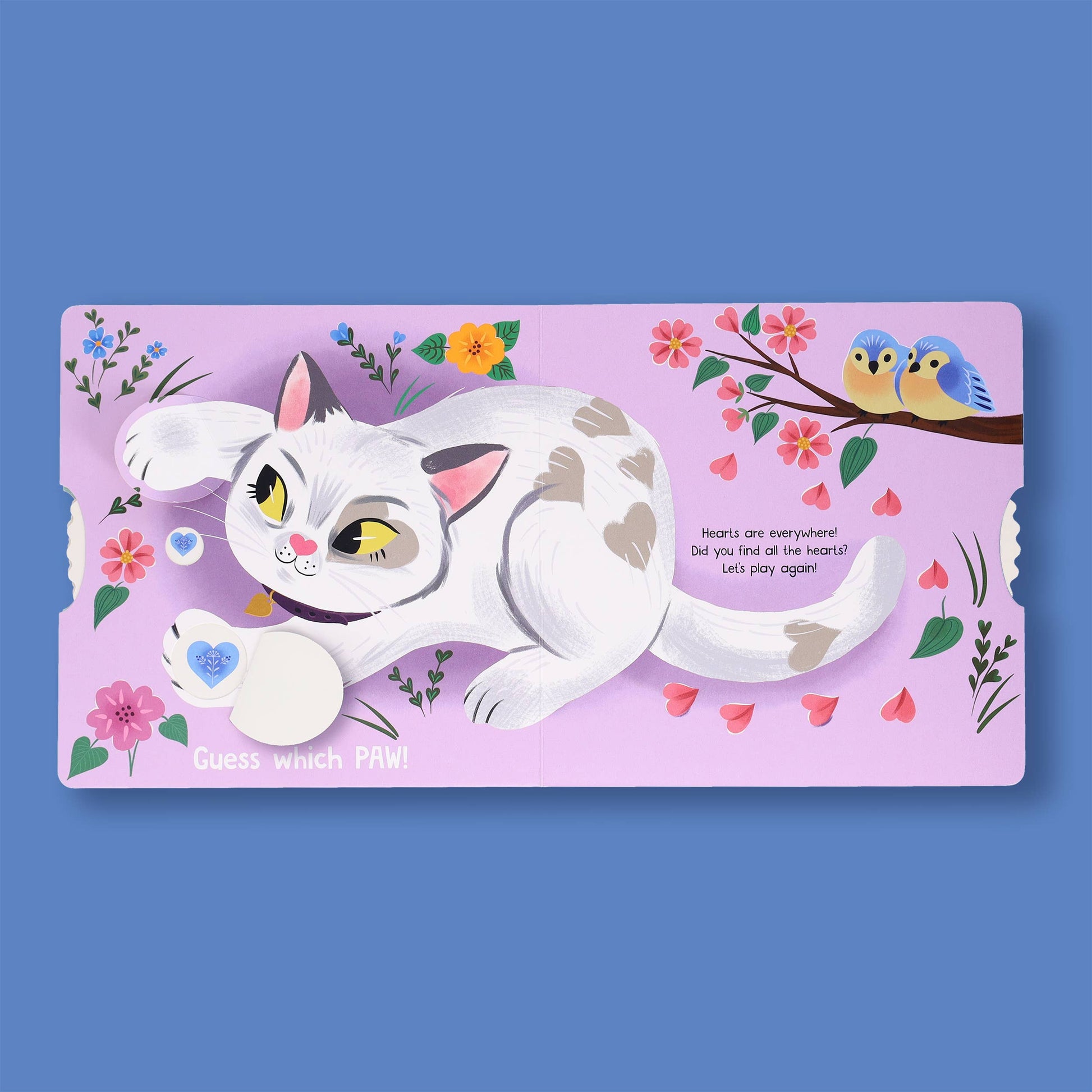A PLAYFUL GAME IN A BOOK: This interactive novelty book will keep kids engaged as they turn a wheel to hide and seek bright hearts under colorful flaps.