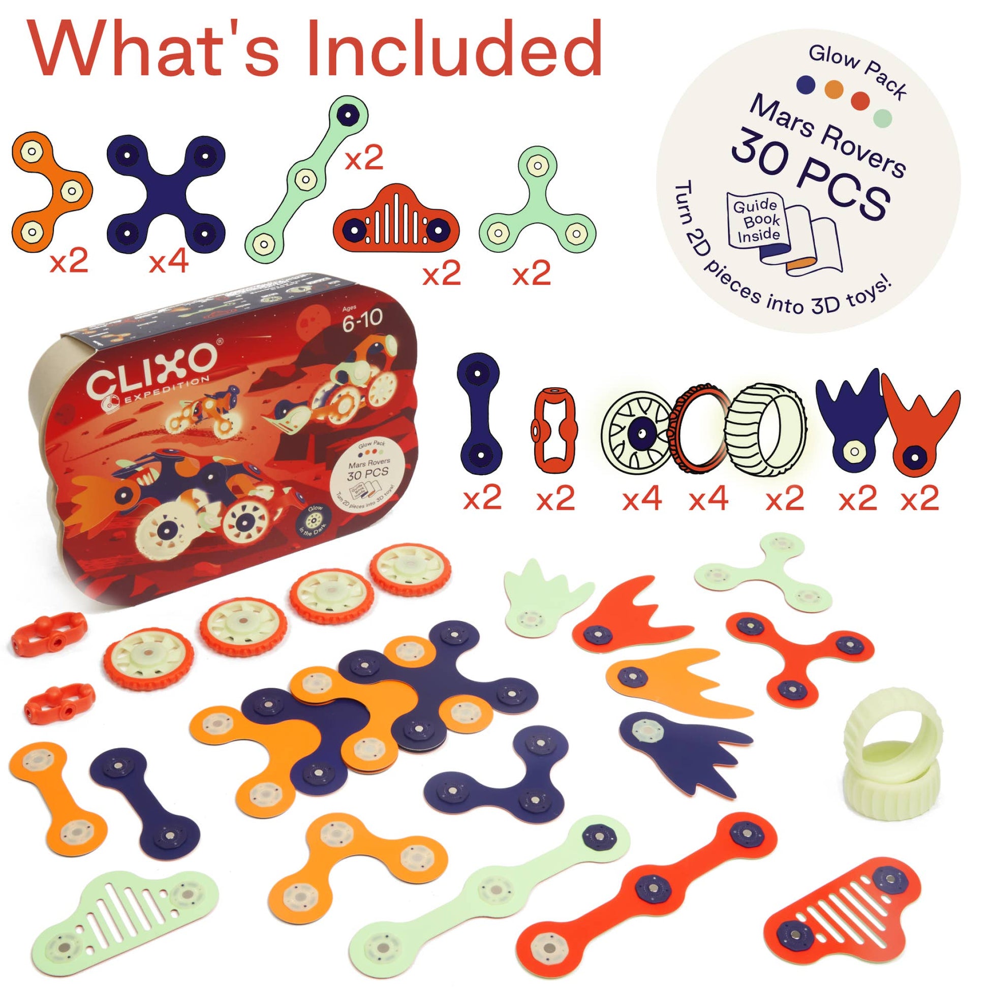 A glow-in-the-dark flexible magnetic building set with all-terrain wheels, fire blasters, and new custom pieces. Build rovers, motorcycles, and space drones to explore Martian landscapes. With 30 pieces in 12 unique Clixo shapes.