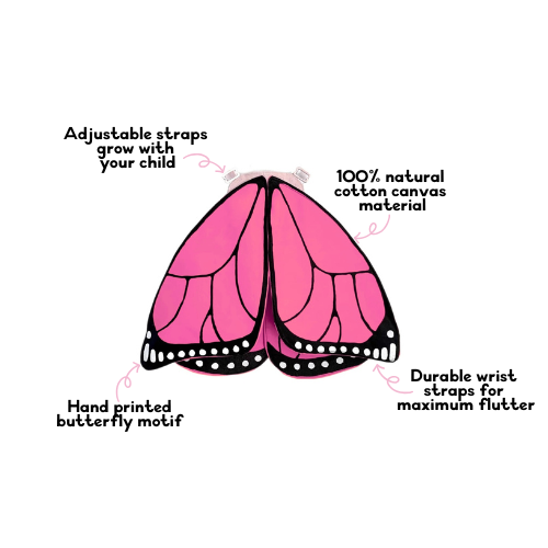 Our Monarch butterfly wings are sure to turn heads and spark little imaginations. Soft bubblegum pink cotton canvas has been meticulously hand-printed to create a beautiful butterfly costume that makes for the perfect pretend play costume, whimsical gift, or creative addition to any Waldorf or Montessori playroom.