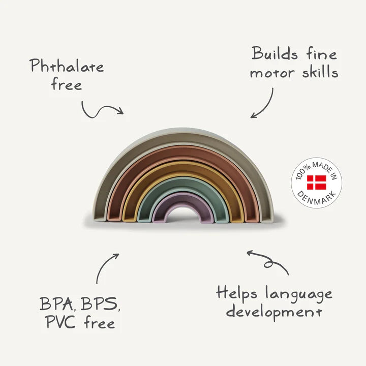 From our Danish hygge collection comes this playful rainbow stacker, inspired by the rainbow skywalk in Aarhus, Denmark. Little ones will sort, stack and play with this beautiful set, all while learning with soft colors and developing their fine motor skills.