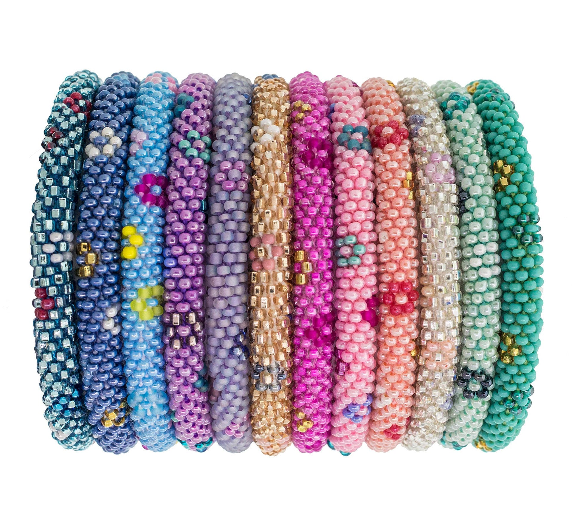 Step into a vibrant garden of style with our Flower Power Roll-On® Bracelets, featuring a delightful combination of blues, pinks, purples, and greens.