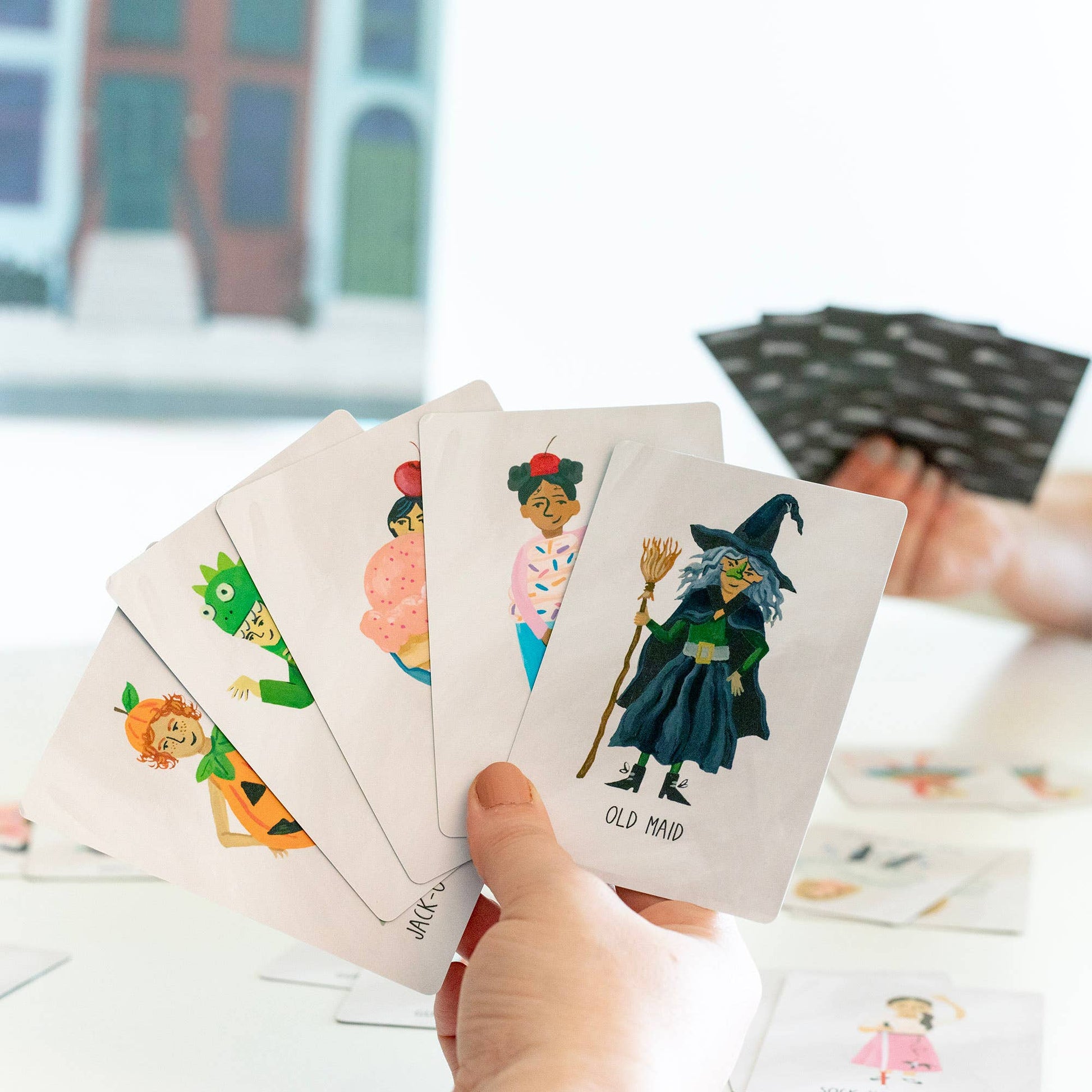 The Trick-or-Treaters Old Maid Card Game features vibrant, hand-drawn illustrations of adorable trick-or-treaters in their Halloween costumes. Every card brings the joy and magic of the season to your game night!