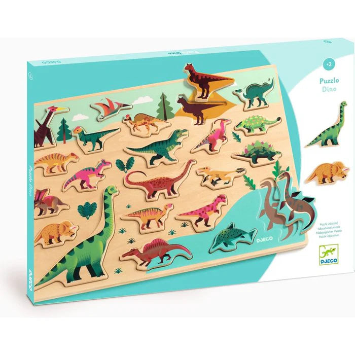 A dinosaur-themed wooden puzzle. Put the 22 pieces in their places by recognizing the dinosaur shapes on the board.
