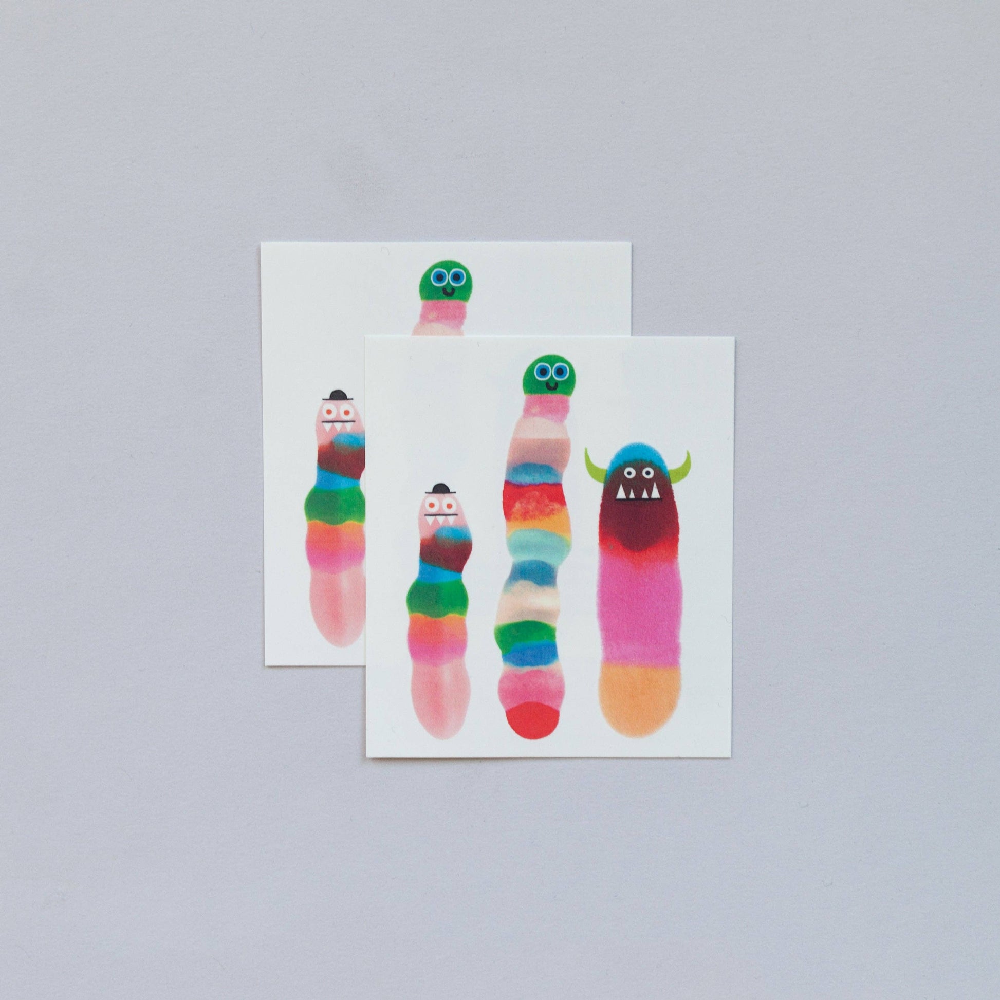 You may wonder what's hiding behind those devilish grins. These Wormies have a secret but that's between them and their artist, Rob Hodgson. Tattly Pairs include two of each design packaged in a polybag and sealed with a branded topper that's ready to hang. Topper is 2" tall and these tattoos vary in size.